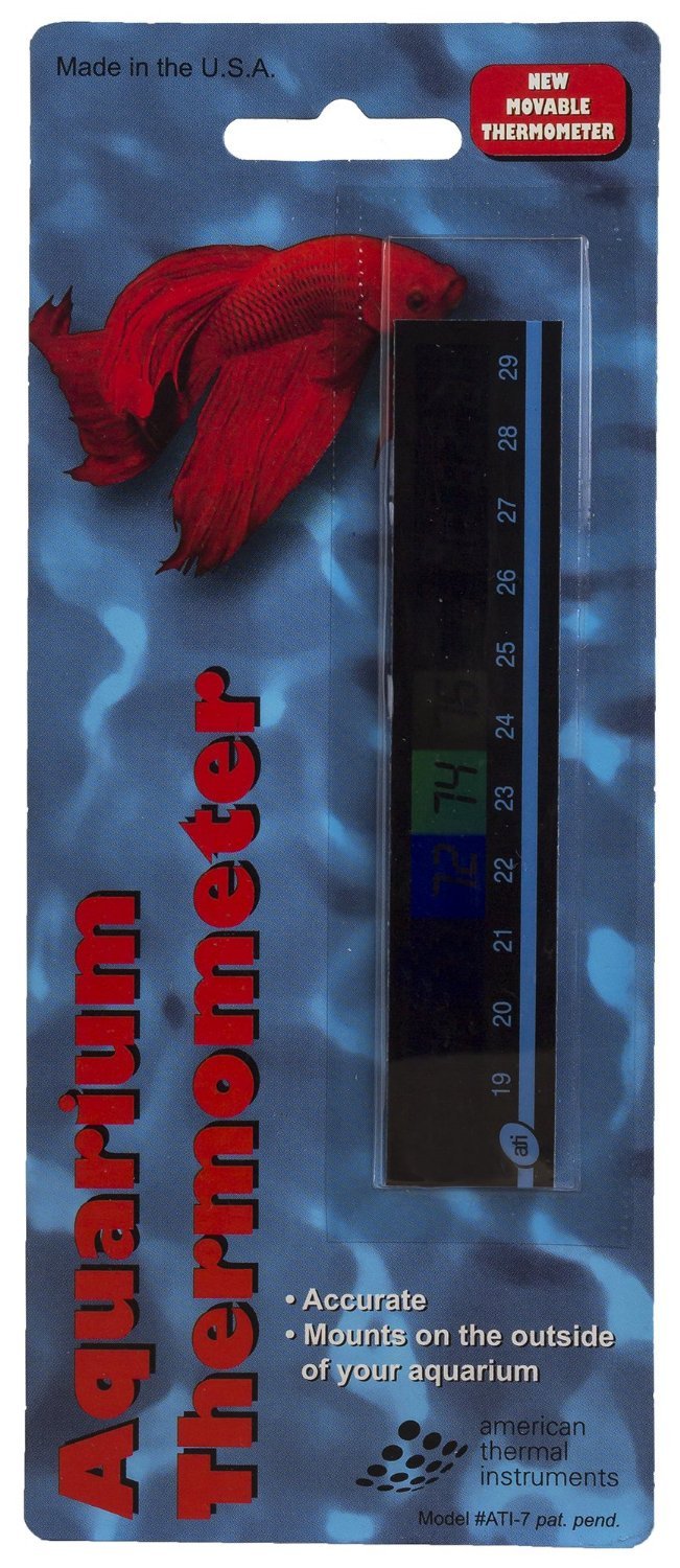 The American Thermal Instruments Aquarium Thermometer is a horizontal stick on thermometer. It uses a liquid crystal that changes colors to temperature.